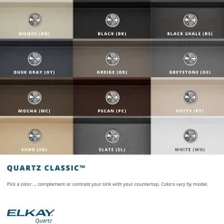 Elkay Quartz Classic sinks have a smooth surface and a visible depth to their structure. They’re crafted from natural quartz and come in a range of UV-stable neutral colors in shades of black, brown, gray and white that allow you to add an unexpected pop of color to your space. Whether it’s a kitchen sink or a prep, bar or laundry sink, this composite sink has the durability you need to take on tough tasks. Available in ADA depths.