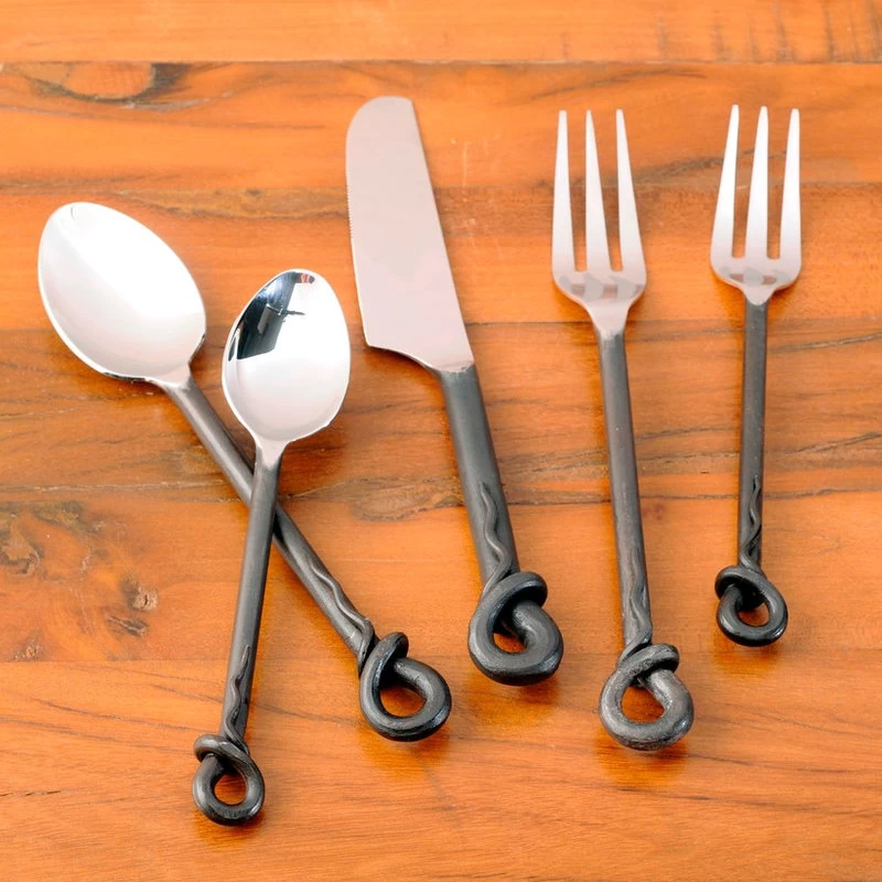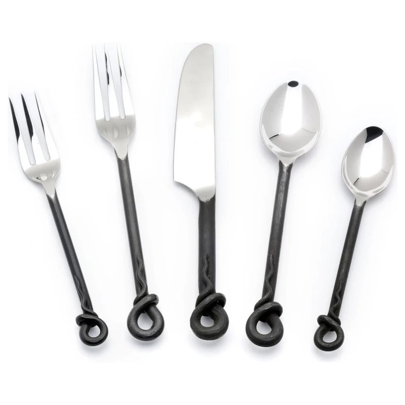 SKU: CUT001 Categories: Flatware, Flatware & Silverware Sets, Tabletop Tags: 18/2 stainless steel, 5 piece dinner set, Burnished, Flatware, Global inspired, Hand forged