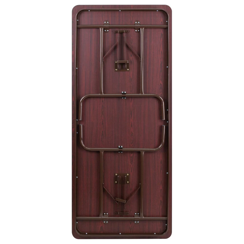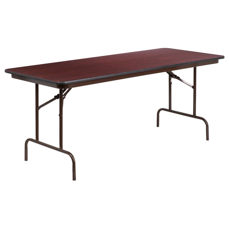 If it seems like you never have enough table space when it’s time for the party, this rectangular folding table is here to save the day. This mahogany finish melamine laminate table is beneficial in a multitude of settings that include banquet facilities, cafeterias, schools and in the home. The table can be used as a temporary seating solution or be setup for everyday use. The pedestal legs fold under the table for convenient storage and better portability, and include floor caps to help protect flooring. This table is commercial grade to withstand everyday use in the hospitality industry.