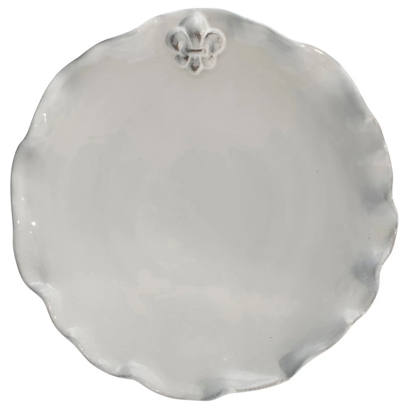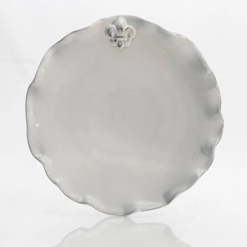 A handmade ruffled edge plate with Fleur de Lis symbol and white washed glaze finish. Practical yet charming. Made in Italy. Dishwasher, Microwave, & Oven Safe.