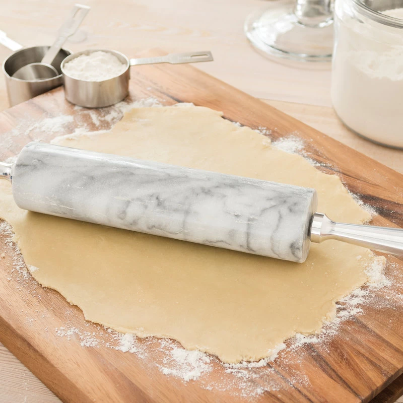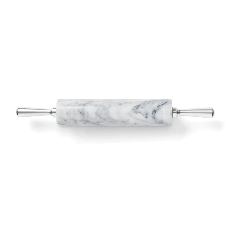 Enjoy baking cookies or rolling out your own pizza dough with the family? Then bring some ease to your baking with this White Marble Rolling Pin! The rolling pin is 17.5″ long, and 2.5″ diamter. Features aluminum handles and a marble base for rest. The marble helps keep the dough cool while rolling, and its natural non-stick properties keep dough from clinging. Even the toughest doughs are flattened easily and effortlessly. Let the smoothness and heft of this rolling pin do the hard work for you!