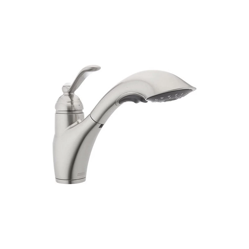 The Franke USA 115.0287.056 Single Handle Pull Out Kitchen Faucet will define any decor you match it to with elegance and simple charm. This faucet is all about being stylish without sacrificing practicality. The matching pull out spout lets you direct the water where you need it and makes pot filling a breeze! With it’s timeless satin nickel finish, this product’s color will be sure to stand out among your decor. Full installation kit includes all hardware needed to install. Hoses are NOT Inlcuded . Low lead compliant.Features:Satin NickelSingle Lever HandleLow Arc with Pull Out SprayerOne Hole InstallationLow Lead Compliant