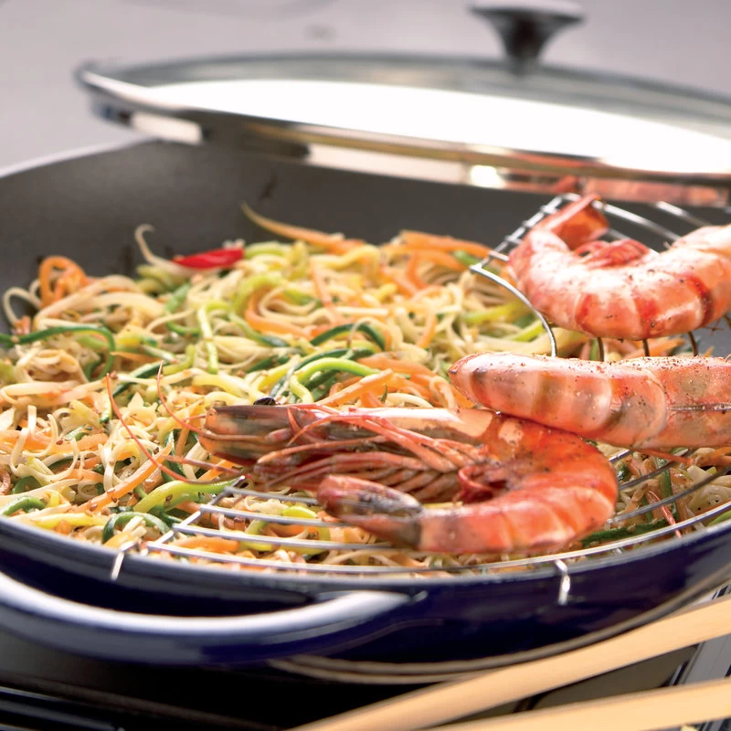 Chasseur’s wok, made in France, is perfect for cooking and serving the latest riced vegetable creation or your traditional stir fry. The cast iron heats evenly on the base and the sides, retains heat and is easy to clean. Use on all stovetop surfaces, oven and open flame. The glass lid with an elegant stainless steel knob is useful for visibility and preventing splatters. Includes wood tongs, two chopsticks and a stainless steel grid.