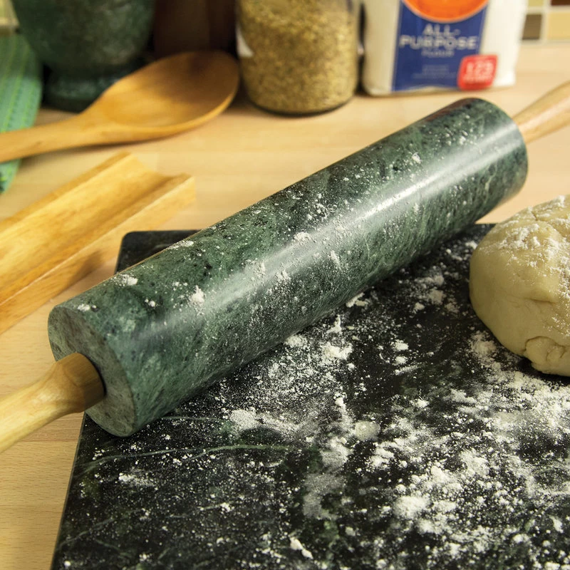 Enjoy baking cookies or rolling out your own pizza dough with the family? Then bring some ease to your baking with this Green Marble Rolling Pin! The rolling pin is 10″ long, has nylon ball bearings for a smooth rolling, wooden handles for easy grip, and a wooden base for rest. The marble helps keep the dough cool while rolling, and its natural non-stick properties keep dough from clinging. Even the toughest doughs are flattened easily and effortlessly. Let the smoothness and heft of this rolling pin do the hard work for you!