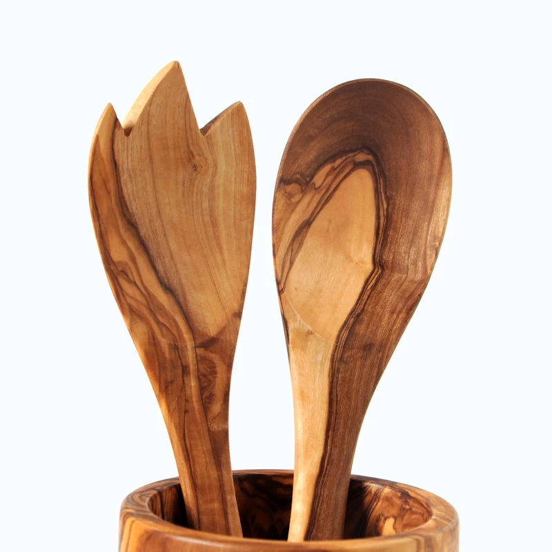 A truly unique handcrafted olive wood 12″ utensil salad server set. This beautiful utensil set is made from a solid piece of durable and dense older trees that no longer produce fruits. A beautiful unique grains in each item that has been aged and treated with olive oil. The olive wood wooden spoon and fork are never made using bleach, dyes or chemicals. This particular wooden salad server set is perfect kitchen tool to use wile serving your everyday salad. The utensil tool set of spoon and fork is a beautiful and unique adding to your collection of handcrafted olive wood and makes an exquisite gift… Please note: Due to the handcrafted of the grained olive wood product, all items might be slightly different; each item is a unique piece of art.
