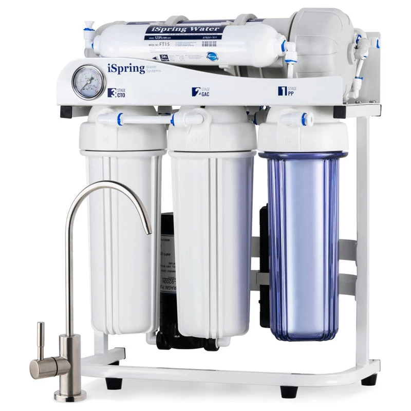 The RCS5T is engineered to meet the needs of light commercial and high demand environments, making it the optimal choice for small restaurants and small businesses. It produces reverse osmosis water at up to 500 gallons per day, a pace that allows it to function as a tankless system without affecting functionality or convenience. The centerpiece of the system is its RO membrane that receives water from both sides of the membrane housing and is fueled by a high powered booster pump. Higher water pressure to the RO membrane results in faster RO production and less drain water being rejected. These factors culminate in the RCS5T achieving an exceptional 1.5:1 pure to drain water ratio. The RCS5T can be used with water pressure sources as low as 40 psi, and has a built in pressure gauge to provide an accurate pressure reading. A power source is required for the booster pump, and a holding tank can be added to the system for high usage situations.