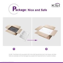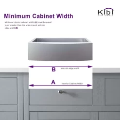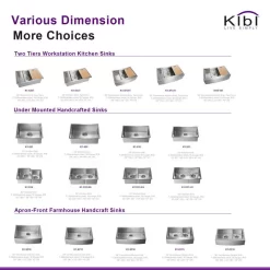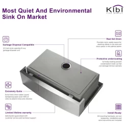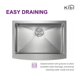 “This KIBI Farmhouse kitchen sink offers professional style with easy-to-clean curved corners. Made of thick, premium quality 16-gauge stainless steel.