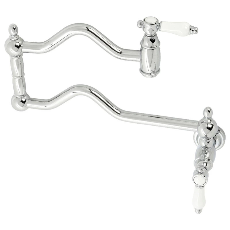 The graceful elegance of timeless design is beautifully merged between British flair and Victorian delicacy within this faucet’s white porcelain levers. As an excellent tool to quickly, easily, and stylishly fill pots, eliminate strain on your joints. Pot-fillers are useful gadgets placed directly above the stove, providing easily accessible water. The foldable swing arms of this pot filler allow for extendable reach of up to 22″ of length and provide long-lasting function due to their sturdy brass construction. Additionally, the dual handles prevent unwanted water spillage while enhancing the traditional theme.