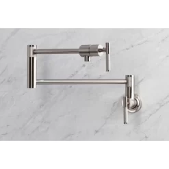 This faucet tastefully interweaves top-notch ergonomic design and the sheen of contemporary simplicity with its black silicone rubber coated handles and cylindrical facets. As an excellent tool to quickly, easily, and stylishly fill pots, eliminate strain on your joints. Pot-fillers are useful gadgets placed directly above the stove, providing easily accessible water. The foldable swing arms of this pot filler allow for extendable reach of up to 21.5″ of length and provide long-lasting function due to their sturdy brass construction. Additionally, the dual handles prevent unwanted water spillage while enhancing the modern theme.
