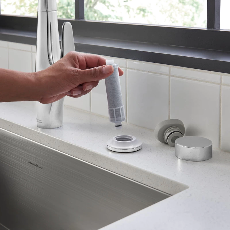 The Saybrook Filtered Kitchen Faucet Replacement Filter by American Standard ensures cleaner, fresher-tasting water. This activated carbon filter is designed for use with the American Standard Saybrook Filtered Kitchen Faucet and is easy to access and install above-deck in the countertop or on the inside cabinet wall.