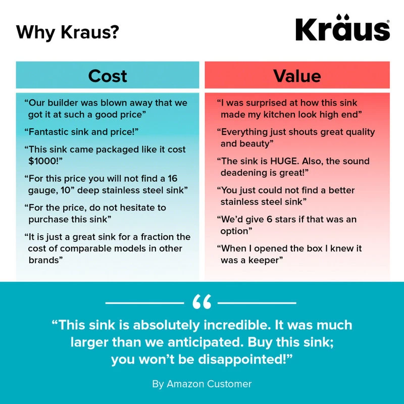 Product Features: Kitchen sink finished in stainless steel; Sink composed of stainless steel; Installation type: Undermount; Number of faucet holes: 0; Drain placement: Rear; Number of basins: 1; Basin rack included; This sink is warrantied and manufactured by Kraus; Overall Dimensions: Overall sink length: 30″; Overall sink width: 18″; Overall sink height: 10″; Basin Dimensions: Interior depth: 10″; Interior length (left to right): 28″; Interior width (front to back): 16″;