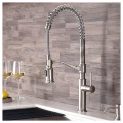 - Commercial pull-down design combines an industrial open coil spout with traditionally-inspired details for a timeless look, offers the convenience of a pull-down spray head with extended range of motion
