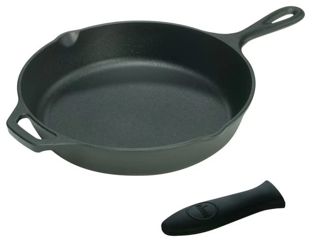 Enjoy the superior taste that well seasoned cast iron cookware offers without all the extra effort when you use this pre-seasoned skillet from Lodge. Part of their renowned Logic line, this skillet has a long handle and a helper handle for added convenience. This skillet also comes with a hot handle grip from Lodge, so you can say goodbye to burning your hands while you use your cast-iron cookware. Designed to slip directly onto the handle of pots and pans, the handle holder insulates your hands from extreme heat. Made from black silicone, the it is heat safe up to 450 degrees F. Made in the USA, this cast iron skillet and handle grip make a great addition to every kitchen.