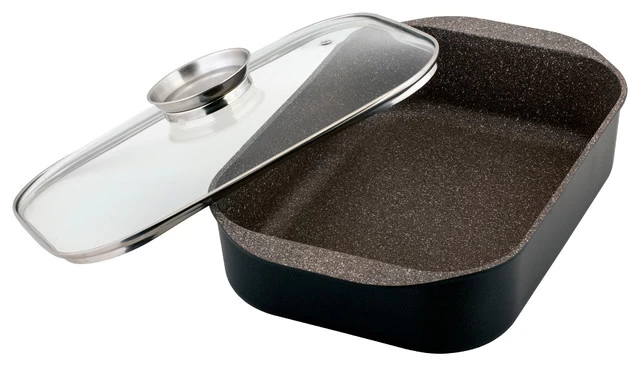 The die-cast aluminum non-stick MERCON roasters with aroma knob heat up fast and distribute heat evenly ensuring favorable outcomes in your kitchen every time. They are coated with a GERMAN granitec C2 nonstick coating by GREBLON and come with a heat resistant glass lid up to 392 degrees fahrenheit. Opening measures 13.5″ x 9.6″ and has a 6.0L capacity. Oven and dishwasher-safe. Use oven-gloves to handle when heated. Suitable for all cookers including gas, electric, ceramic, halogen, and induction. Made in China.