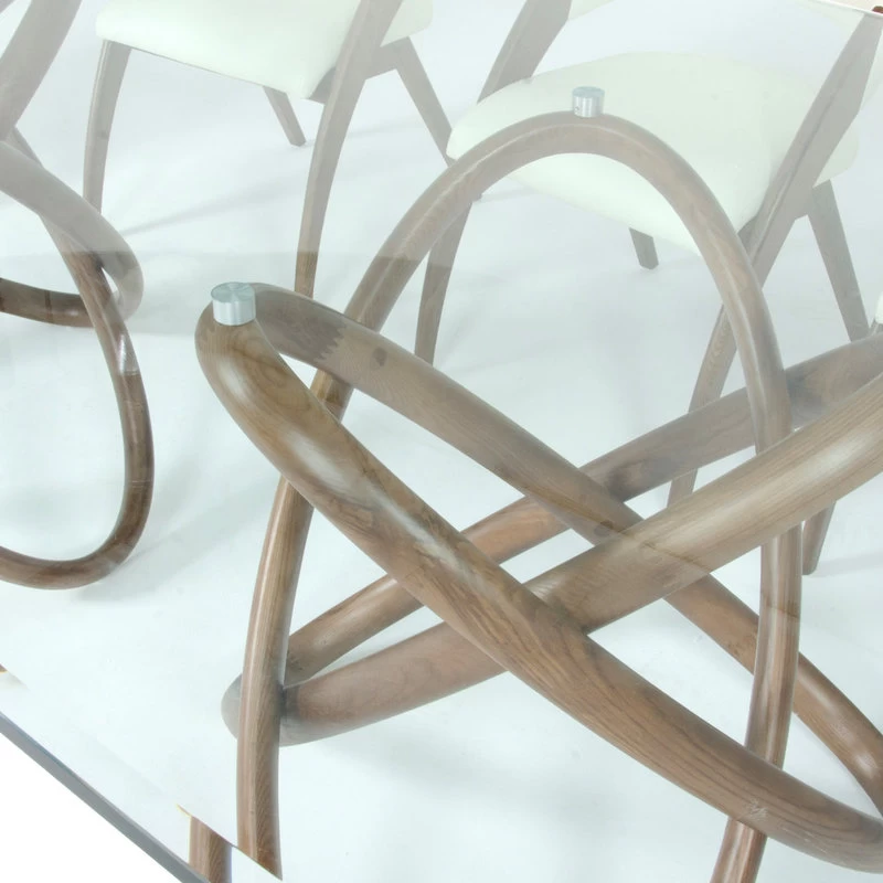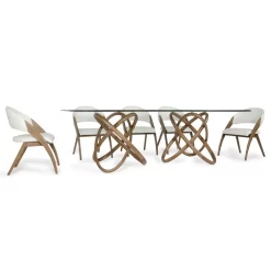 The Modrest Mason Modern Glass & Walnut Dining Table exudes ingenuity featuring an intersecting spherical Walnut finished solid ash wood base. It features a 19-mm rectangular clear tempered glass top with rounded corners that makes it child-friendly. This modern table has a dimension of W94″ x D47″ x H30″.