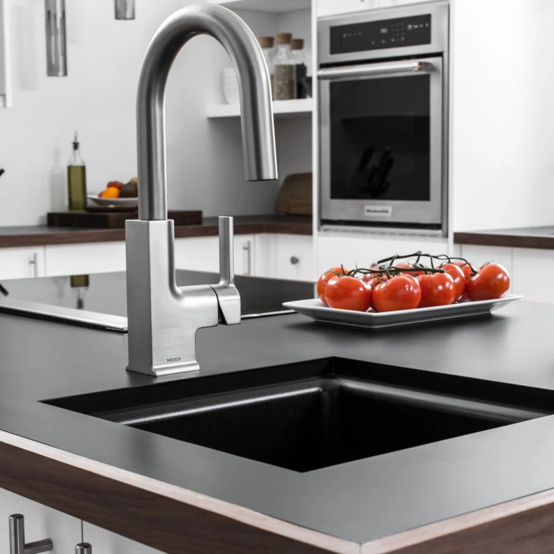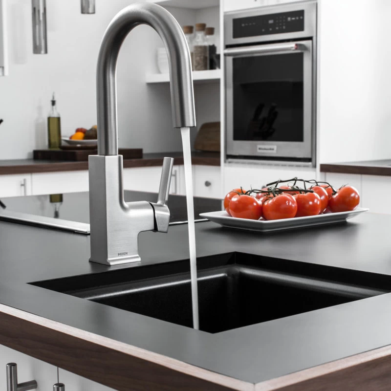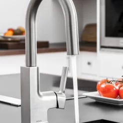 Moen S62308 Features: Faucet body constructed of metal to ensure durability and dependability Covered under Moen’s limited lifetime faucet warranty Finishes resist corrosion and tarnishing through everyday use – finish covered under lifetime warranty Precision lines from top to bottom create a style that can be carried throughout contemporary kitchens Moen sets the standard for exceptional beauty and innovative reliable design Single handle operation control the flow and temperature of water Pull-down spray faucet head with 68″ hose and 2 spray functions Spout swivels 360-degrees providing greater access to more areas of the sink High-arch gooseneck spout design provides optimal room under the faucet for any size task ADA compliant Low lead compliant – faucet meets federal and state regulations for lead content WaterSense certified product – using at least 30% less water than standard 2.2 GPM faucets, while still meeting strict performance guide lines Mounting hardware included Moen S62308 Technologies and Benefits: Reflexâ„¢: A technological innovation created based on input from actual faucet users, Reflexâ„¢ is made to work the way you do. Featuring exceptional range of motion, the spray wand on Reflexâ„¢ faucets swivels to optimize maneuverable range. Only pulldown faucets with the Reflexâ„¢ system will retract back to the docked position from any distance without assistance. Compared to other pulldown designs Reflexâ„¢ will also make the spray head up to 40% easier to unlatch. Spot Resistâ„¢ Finish: Spot Resistâ„¢ stainless finish resists fingerprints and water spots for a cleaner looking kitchen. WaterSense/Eco-Performance: Moen is making a global difference by partnering with environmental organizations and creating eco-friendly products. WaterSense products feature a flow optimizing aerator; these products use less water without sacrificing performance. Duralast: An exciting new proprietary cartridge design that offers a smooth feel and reliable operation of a new faucet from the first use to the last use. This new cartridge combines innovative engineering and the highest quality materials. It surpasses conventional durability standards to withstand the toughest conditions, including hard water. Duralockâ„¢: Duralockâ„¢ Quick-Connect is a one-step, no tool installation system. The intuitive design is hassle-free, just listen for the ‘click’ sound to assure a reliable connection that will last for the lifetime of the faucet Moen S62308 Specifications: Height: 14-5/8″ (deck to top of faucet) Spout Height: 7-7/8″ (deck to spout outlet) Spout Reach: 7″ (center of faucet base to center of spout outlet) Flow Rate: 1.5 gallons per minute Faucet Holes: Single Hole Faucet Hole Size: 1-1/2″ Max Deck Thickness: 2-1/2″