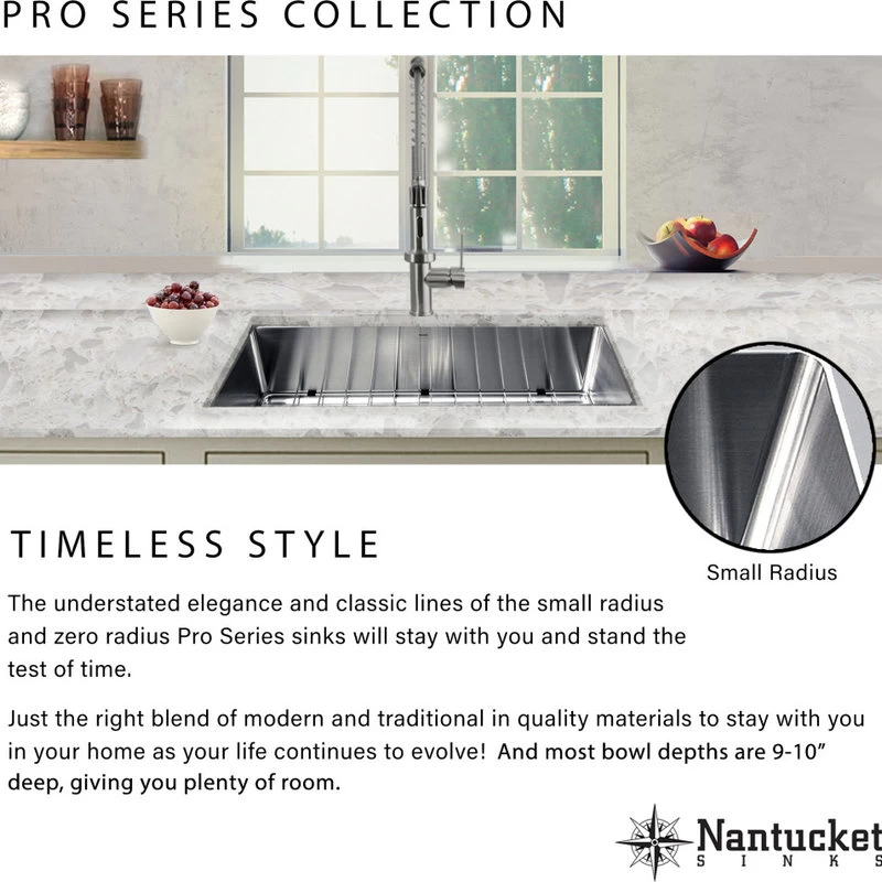 This undermount Pro Series king size rectangle sink provides Small Radius corners for additional space and a fresh modern industrial look. The bottom of the sink has channel grooves to divert water for proper drainage. At home in both traditional and modern kitchens, our Pro Series stainless sinks provide a lifetime of functionality. Fabricated from premium gauge T-304 stainless steel for maximum durability, the 10 ” deep basin easily accommodate dishes. Nantucket Sinks stainless steel sinks have thick rubber dampening pads to dampen sound. Our finishing process helps keep our stainless steel corrosion-resistant to rust and oxidation. The satin finish makes daily maintenance a simple rinse!