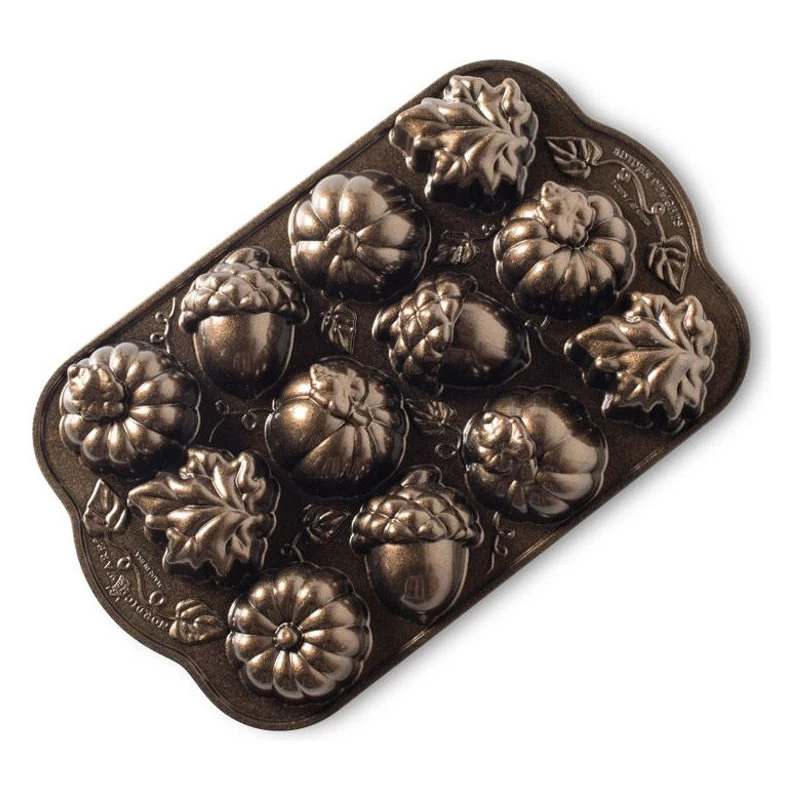Bake delicious mini cakes with this Autumn Delights cakelet pan from Nordic Ware. This gold pan is made from cast aluminum so it’s tough and durable. The baking surface is nonstick so your cakes easily release from the cavities. The cavities feature leaf, pumpkin, and acorn shapes while integrated helper handles make transporting from oven to table simple. Even better, this pan is made in the USA and is backed by a manufacturer’s lifetime warranty.