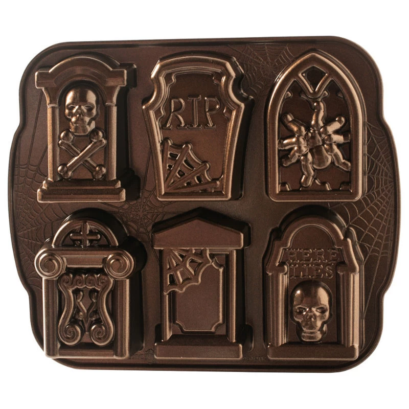 Bake scarily delicious mini cakes with this tombstone cakelet pan from Nordic Ware. This brown pan is made from cast aluminum so it’s tough and durable. The baking surface is nonstick so your cakes easily release from the cavities. The cavities feature various tombstone designs while integrated helper handles make transporting from oven to table simple. Even better, this pan is made in the USA and is backed by a manufacturer’s lifetime warranty.
