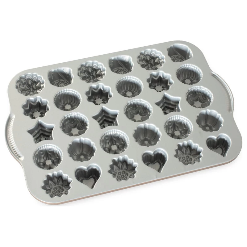 Bake a delicious batch of tea cakes and candies this holiday season with this bundt sheet pan from Nordic Ware. Constructed from heavy cast aluminum, this pan is perfect for making party desserts or elegant gifts. The exquisitely detailed shapes include an elegant heart, chrysanthemum, sunflower, rose, cathedral Bavaria, fleur de lis, star, and the original Bundt. Nonstick coated for easy release and cleanup, this pan provides fine details, superior baking performance, and a heat reflective exterior for uniform browning. Backed by a manufacturer’s limited lifetime warranty, this pan is sure to produce impressive results time and again. Best of all, it is proudly made in the USA, for quality you can depend on.