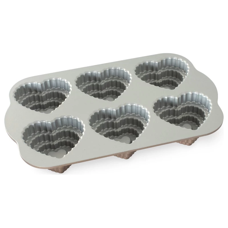 Bake up a delicious dessert with this tiered heart cakelet pan from Nordic Ware. Made of cast aluminum, this pan creates six tiered hearts. The non-stick finish allows for easy removal of baked goods and quick cleanup. Made in the USA and backed by a manufacturer’s lifetime warranty, this sheet is the perfect addition to any baker’s kitchen.