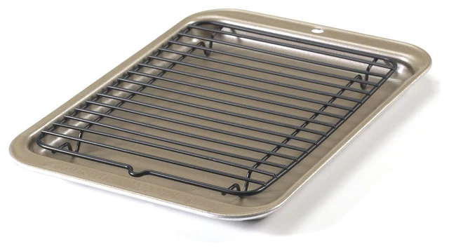 Broil or cook your favorite meals in your toaster oven, outdoor grill, camp stove or RV stove with this two piece set from Nordic Ware. The set includes a baking sheet with a non-stick finish and a removable broiling tray. It is constructed of heavy aluminum and is the ideal size for smaller appliances. Handwashing in hot, soapy water is recommended, and Nordic Ware offers a 10-year warranty on their USA-made bakeware.