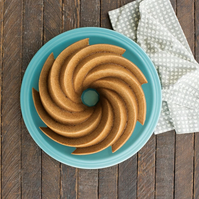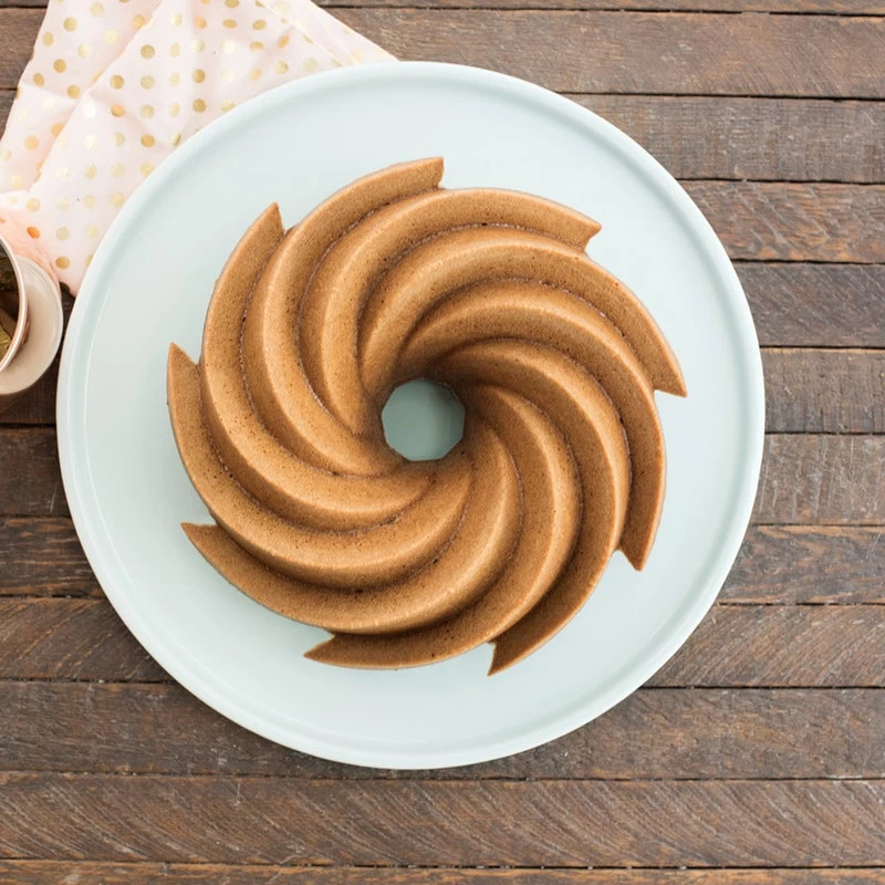 Give pound cake a festive flair by baking in this Heritage bundt mold from Nordic Ware. Made from cast aluminum, this pan is gold colored to give this already beautiful pan an extra touch. The baking surface is non-stick so that your cake easily releases. The symmetry of this pan makes it beautiful and perfect to use in all occasions. Its non-stick properties make it easy to clean, and it is made in the USA with a lifetime warranty.