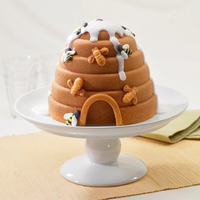 Make a delicious honey orange flavored cake with this Beehive cake pan from Nordic Ware. Made from cast aluminum, this pan is perfect for a springtime celebration. In the shape of a beehive with bees all over, this mold joins together to make a 3D cake that will wow your guests. The baking surface is nonstick for easy release, and it has helper handles for transporting. This cake pan was made in the USA and has a manufacturer’s lifetime warranty.