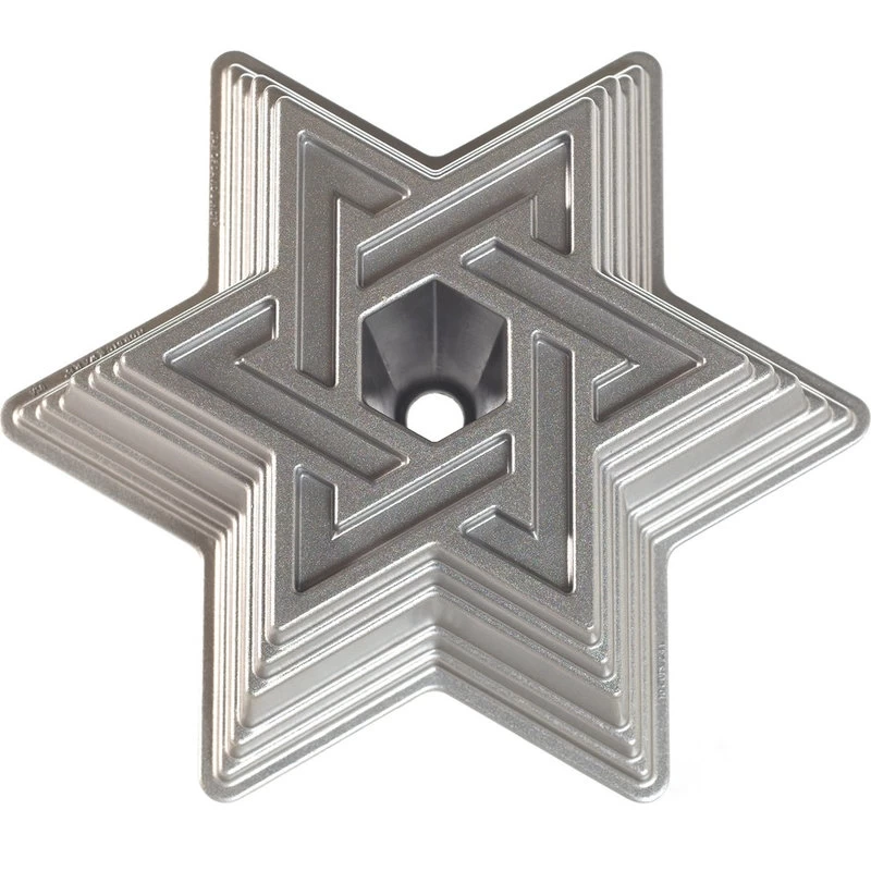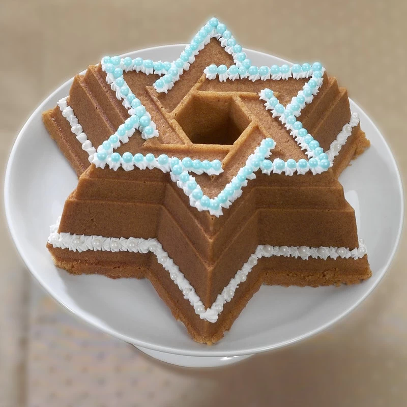 Make perfect six-point star shaped cakes with the Nordic Ware Star of David bundt pan. Distinctive premium nonstick interiors allow for quick release and easy cleanup, while heat-reflective silver platinum exteriors ensure uniform browning. This pan is uniquely shaped, creating a Star of David shaped bundt cake that is five tiers with an indented Star of David design, and that has a hexagon-shaped hole in the center. Made in the USA, it is backed by a manufacturer’s lifetime warranty and allows you to bake delicious masterpieces that are perfect for Hanukkah.