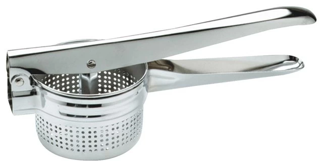 Mash potatoes with this potato ricer from Norpro. Constructed with a shiny triple chrome finish, it is meant to look great and last. This ricer adds air to fresh boiled potatoes to make them light and fluffy. Simply press boiled potatoes through the pierced holes in the base and allow the riced potatoes fall into the pot or bowls.