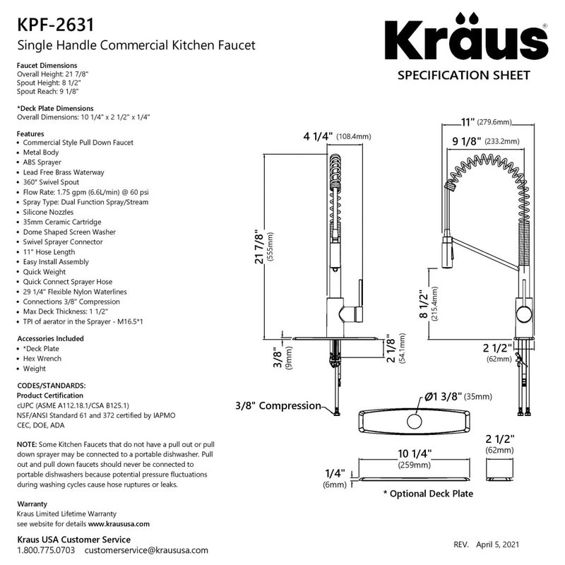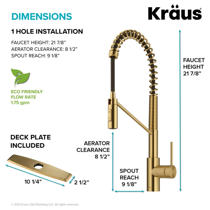 - Faucet Dimensions: Overall Height 21 3/4″, Spout Reach 9 1/4″, Spout Height 8 1/4″