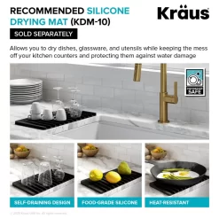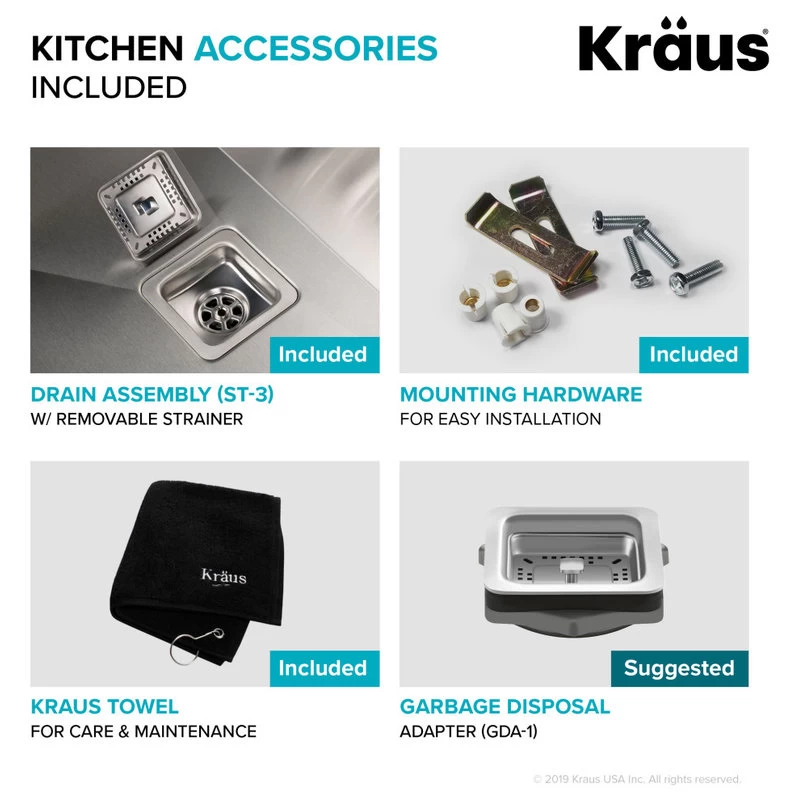 - FREE Accessories: Drain assembly with square strainer, premium Kraus kitchen towel