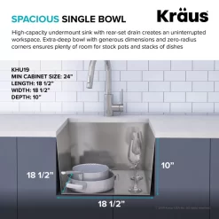 Outer Sink Dimensions: 18 1/2 in. L x 18 1/2 in. W x 10 in. D. Min Cabinet Size: 24 in., Spacious sink perfect for a compact kitchen or entertainment area