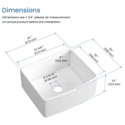 - Due to the firing process and the fact that fireclay sink is handcrafted, all dimensions may vary up to 3/8″. Please measure sink on location before proceeding to cabinet cut-out.