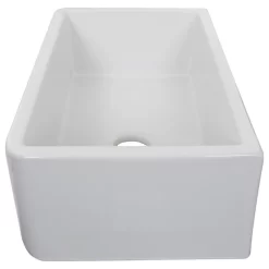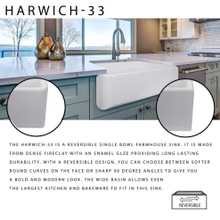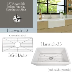 Just how you like it. Our Harwich-33 has got you covered from all angles. This is a 32.75 inch reversible single bowl farmhouse fireclay kitchen sink made in Italy. Offering options depending on your preference, you can use the apron with softer curves for traditional styling or bold 90 degree corner apron for a more modern look. Like choosing a quaint harbor or adventuring out to the ocean beaches, the center drain lets you decide. The wide basin is a bit larger than your average sink to maximize use and accommodate even the largest kitchen and bakeware with no problem. Eco-friendly with its inherent need for less cleansers. Thick and durable in a classic white finish. The Harwich-33 is ready to be a centerpiece to your home’s kitchen for years. Custom base cabinet is required. Due to bottom thickness of sink, an extended flange disposal drain or extended ferrule regular kitchen drain will be necessary.
