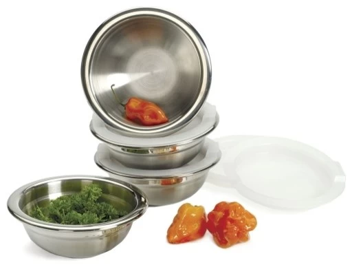 This 8 piece stainless steel prep and store bowl set with lids would make a great addition to your kitchen. Heavy and solid 18/10 stainless bowls feature a brushed finish and wide polished rims. Airtight plastic lids keep food fresh and have raised grip handles for easy removal and stacking. Great for preparing food and covering to put into the fridge until serving time. This set would make a great gift for that special chef.