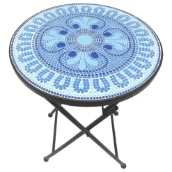 Color, texture, detail, and a compact silhouette, the lori mosaic side table has it all. This decorative accent table is perfect for a cup of coffee in the morning sun or a refreshing glass of lemonade on a hot august afternoon. The table features a colorful multi-color blue tile mosaic design with a classic abstract floral pattern brimming with intricate detail. Because it folds, this transitional table is easy to tuck out of the way when not in use.