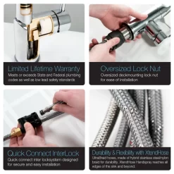 The Scepter is fitted with a removable and easy to clean AeroFlo aerator and provides an Eco-Friendly 1.75 gpm water flow. It is connected to our UltraBraid hybrid stainless steel-nylon hoses, allowing the hand spray to pull out 20+ inches for extra-long reach. Easily fill pots or cleaning buckets outside of your sink with the durability and flexibility of XtendHose technology. Houzer’s proprietary quick connect interlock system and oversized locknut provide easy installation and durability to last for the lifetime of the faucet.