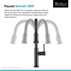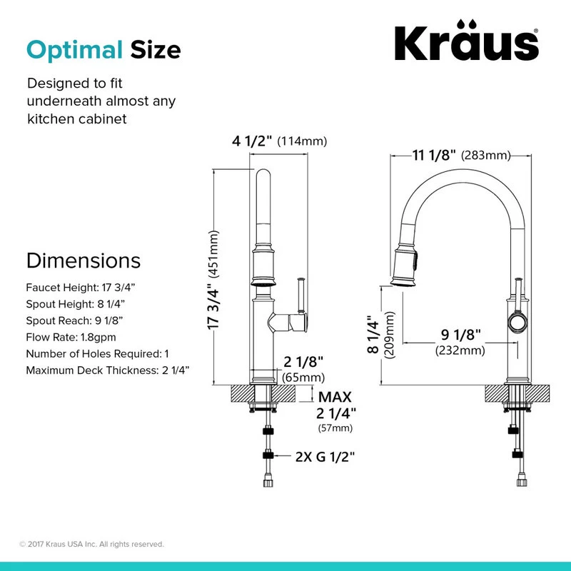 - Faucet Dimensions: Overall Height 17 5/8″, Spout Reach 9 1/2″, Spout Height 8 1/2″