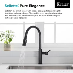 Add an elegant touch to your kitchen with the stylishly classic design of the Sellette faucet. From traditional touches like a beautifully edged base and sprayhead, to the highly functional pull-down design, this faucet has it all. The ergonomic dual-function sprayer has a rocker switch that allows you to change between aerated stream and powerful rinsing spray. Soft rubber nozzles make the sprayface easy to clean, maintaining a lasting powerful flow. A flexible nylon hose with swivel adaptor offers unparalleled range of motion and effortless movement all around the sink. An optional deck plate (included with purchase) allows you to install this single handle faucet with a 1, 2, or 3-hole sink.
