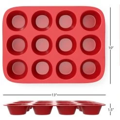 Dimensions: 13 x 10 x 1.5, useful for up to 12 items. Color: Red. Baking temperature tolerance: -40 to 445oF (0-230oC). Made for safe cooking and durability with FDA approved, BPA free, nontoxic, food-grade silicone. This muffin tray is also stain-resistant and top rack dishwasher safe so cleaning is always quick, simple, and worry-free!