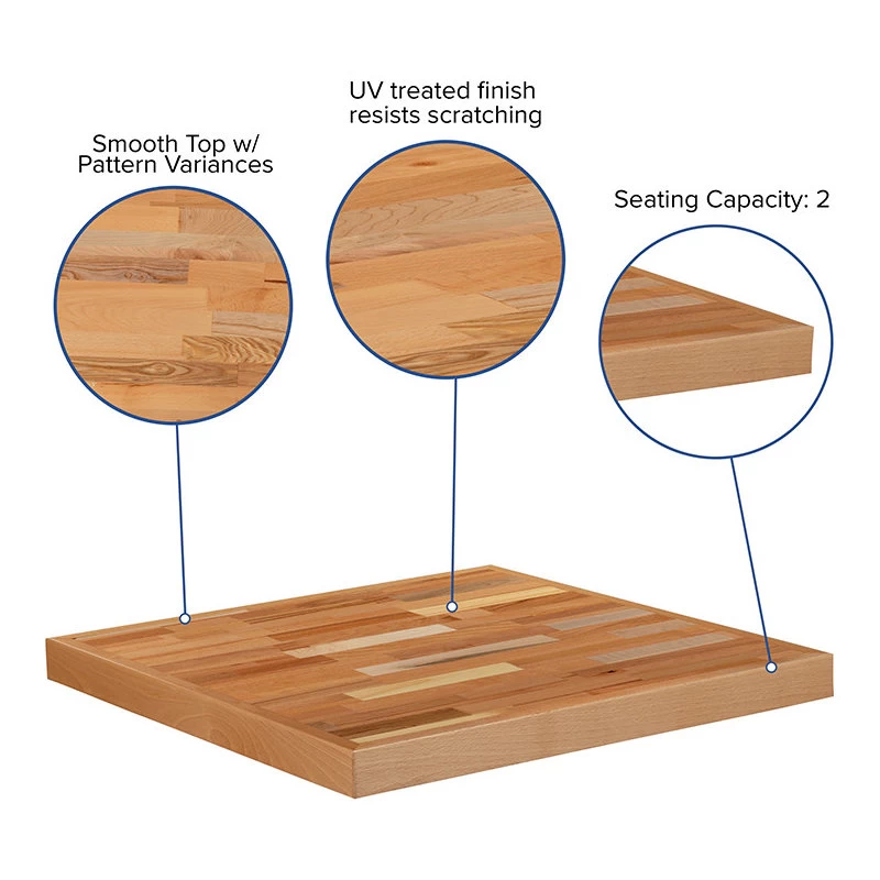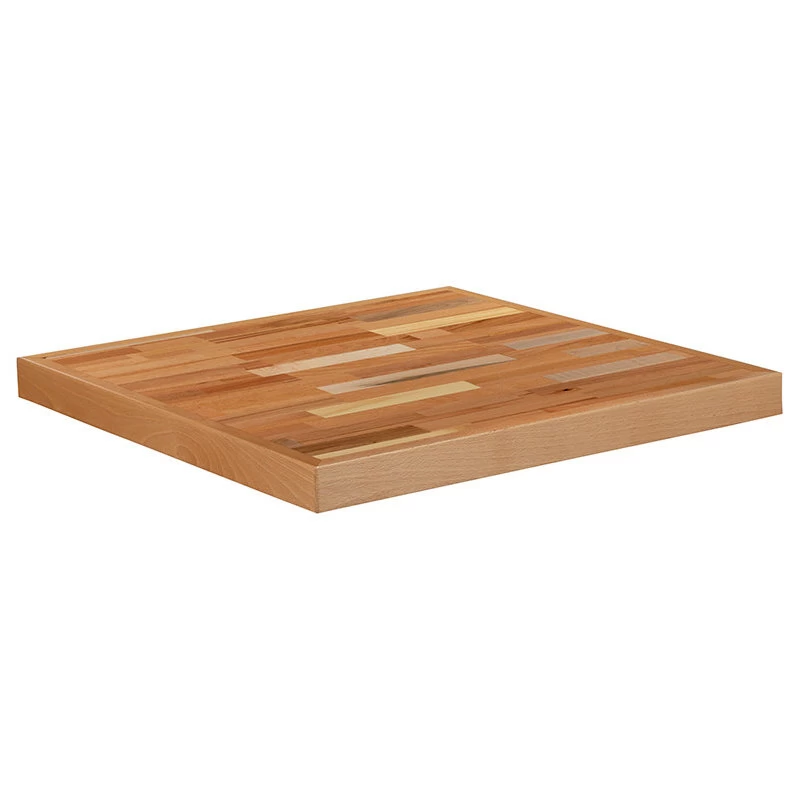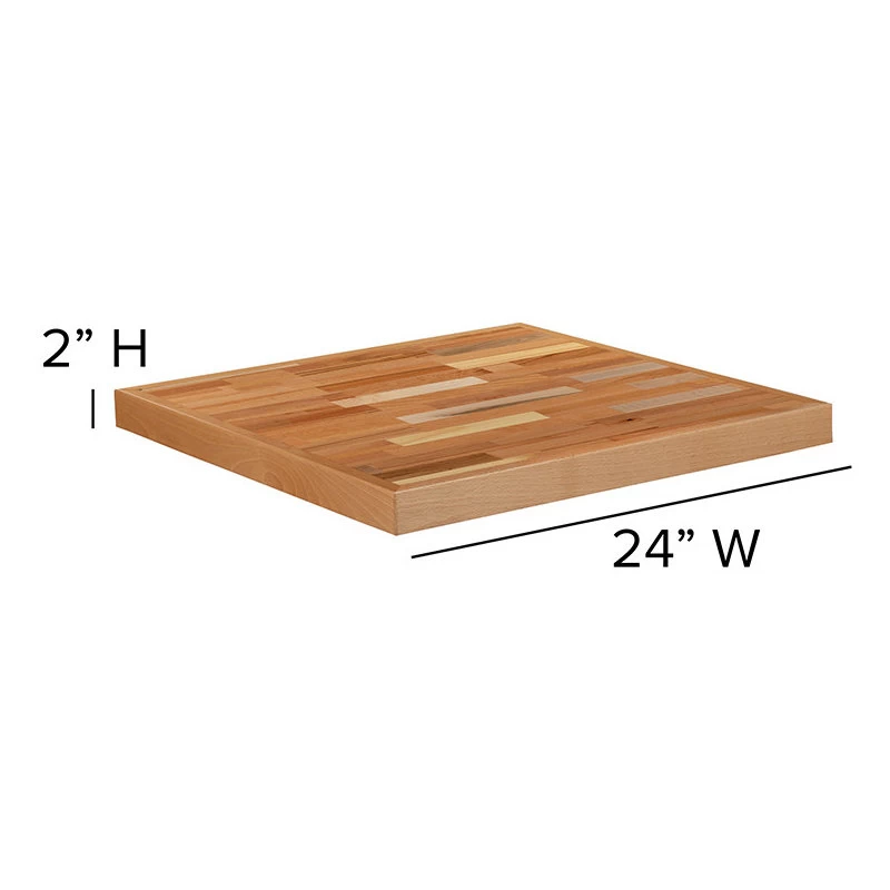 - Add distinct aesthetic to your restaurant, bar, hospitality dining space, or home with the unmatched look of a butcher block top. Environmental-friendly, the durably crafted solid wood table top showcases the beauty of multiple wood types. The heavy-duty thick top will last you for as long as your restaurant is open for business. Use a damp cloth with an alcohol disinfectant containing 70% or higher alcohol concentration followed by a dry cloth to keep your top spotless and germ free. Bring warmth to your dining room with a kitchen butcher block top. Multi-variations in the color add dimension to this smooth tabletop. Complete your square wood dining table with a 22″ x 22″ table x-base or 18″ round table base. Designed to deliver long-lasting performance for a first-rate dining experience.