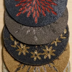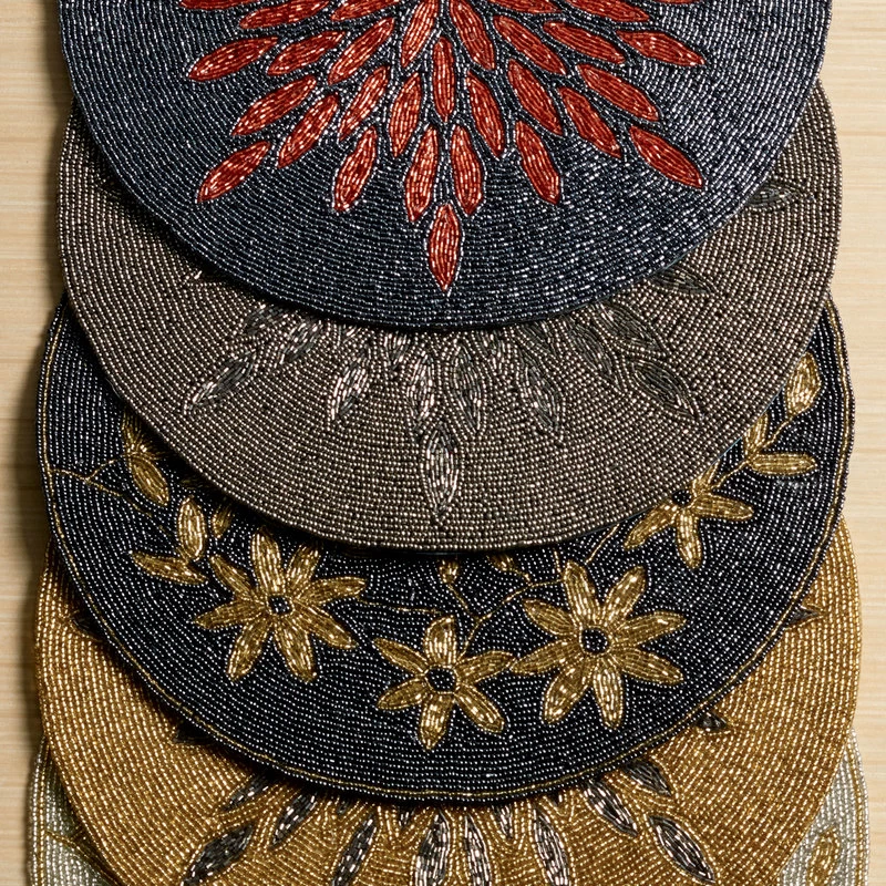 Dress up your table in long-lasting beauty with these hand crafted 15″ round gold with grey sunburst patterned beaded placemats. Each hand strung glass bead is beautiful in its own right, but the amazing shimmer of hundreds of intricately sewn glass beads together creates pure elegance. Utilizing a soft non-scratch woven fabric back, each placemat is sold individually to give you the freedom mix and match.