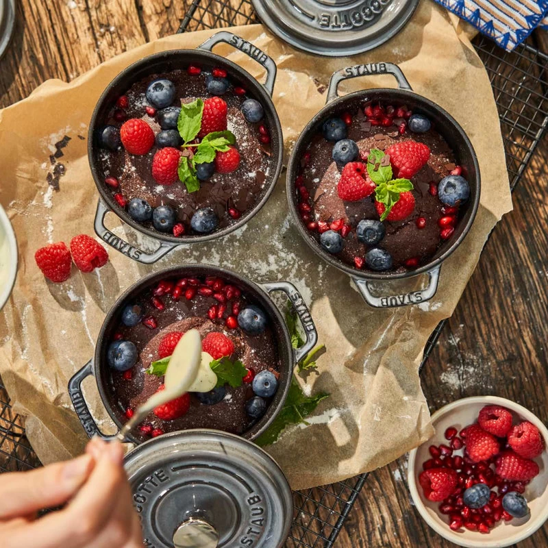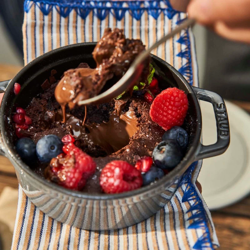 The Staub cocotte is unsurpassed for slow-cooking meats and vegetables to tender perfection, and for simmering hearty stews and soups. Cast iron possesses exceptional heat-retaining qualities, so the pot heats evenly throughout. The innovative lid features tiny spikes on the interior that continually release condensed liquid back onto the food, yielding moist, flavorful results.Staub’s special matte black enamel interior and self-basting spiked lid guarantee perfect browning and braising for flavor-enhanced food. With their exquisite enamel finish, each piece transitions beautifully from the kitchen to the table. From comfort food to sumptuous suppers, every dish is special when served in Staub.Staub enameled cast iron cookware is the choice of the world’s best chefs. With exceptional durability, it is perfect for day-to-day use in both gourmet home kitchens and prestigious restaurants around the world. Built to last a lifetime, these heirloom pieces can be passed from generation to generation.