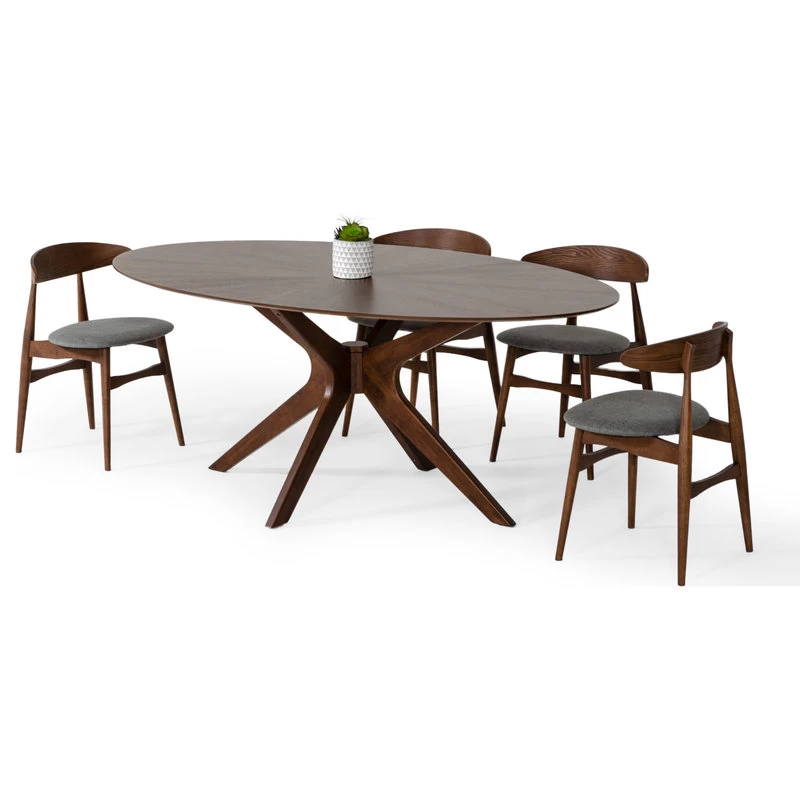 The Beck dining table is a stunning, oval shaped statement piece that comfortably invites up to eight people to gather around. The deep walnut finish and tapered legs lend an industrial, midcentury feel to any room, while the x-shaped base anchors its design in a classic, contemporary silhouette. Hidden in the details, the beveled edge adds a touch of luxury to this already beautiful piece, priming it for every occasion—from big family meals to overdue reunions.