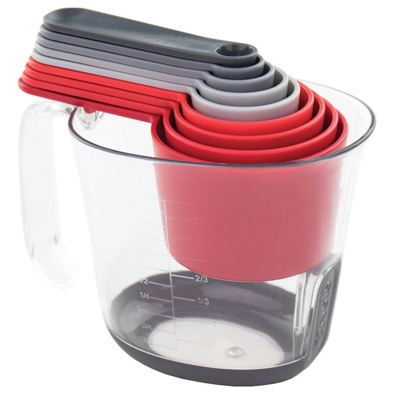 Make a delectable chocolate cake with this measuring system from Tovolo. This ten piece set of nested measuring tools comes in clear, red, and shades of gray so you can easily distinguish the tablespoons from the teaspoons. It includes 1/4 tsp, 1/2 tsp, 1 tsp, 1 tbsp, 2 tbsp, 1/4 cup, 1/3 cup, 1/2 cup, 1 cup and 3 cup measures. The measurement markings are etched in so they won’t fade with time. These tools are dishwasher safe for easy clean up.