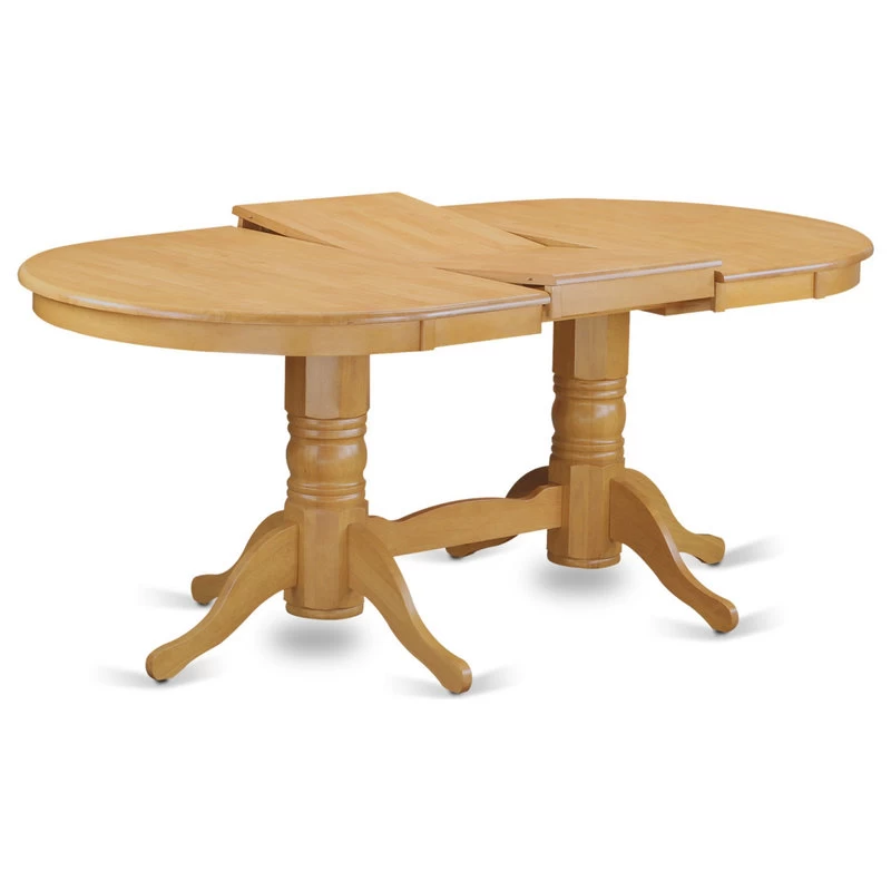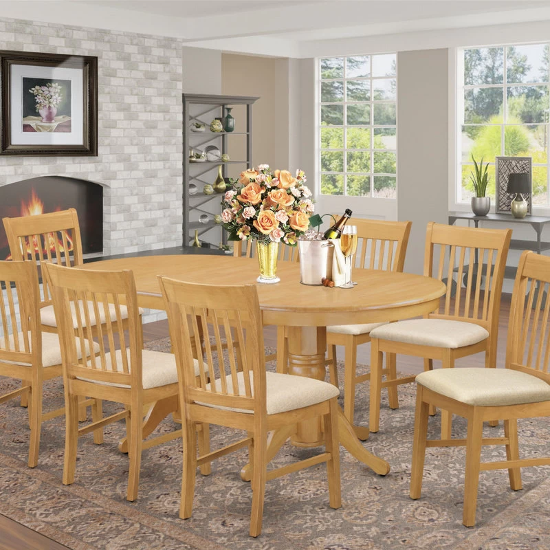 VANO9-OAK-C 9 PC Table and Chairs set – Small Kitchen Table and 8 Dining Chairs This particular kitchen table set includes a long oblong shaped kitchen table that has Two pedestals. This modern day looking set has 8 seats and therefore has an optimal seating capacity of eight individuals. This product has a pleasant, seamless finish and it is made with Asian hardwood, commonly known as Rubber wood. The dining room table would fit suitably in your dining room.