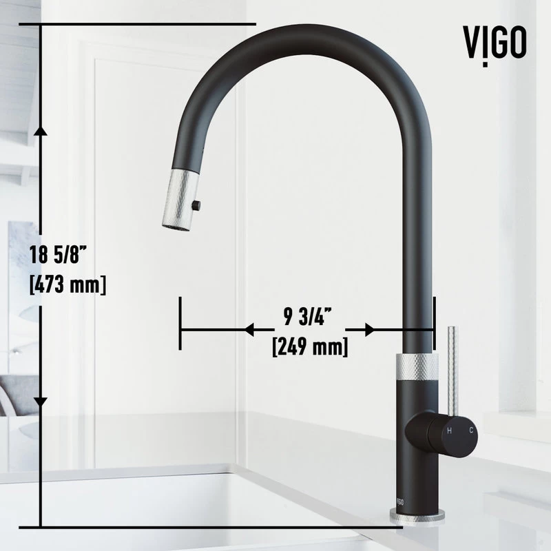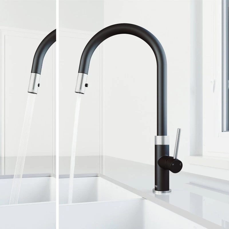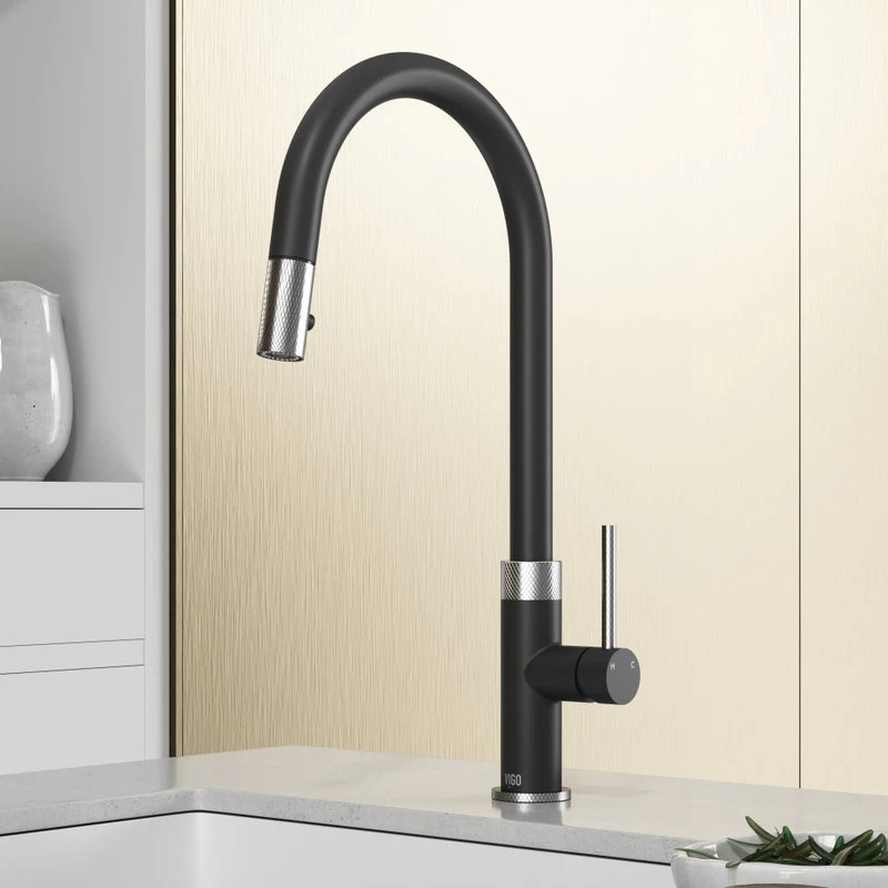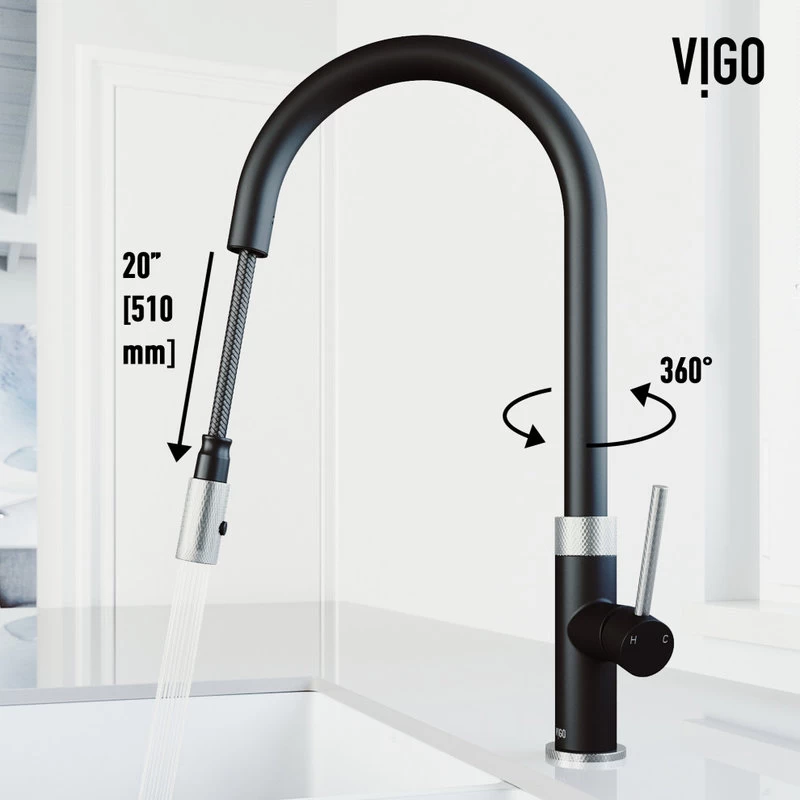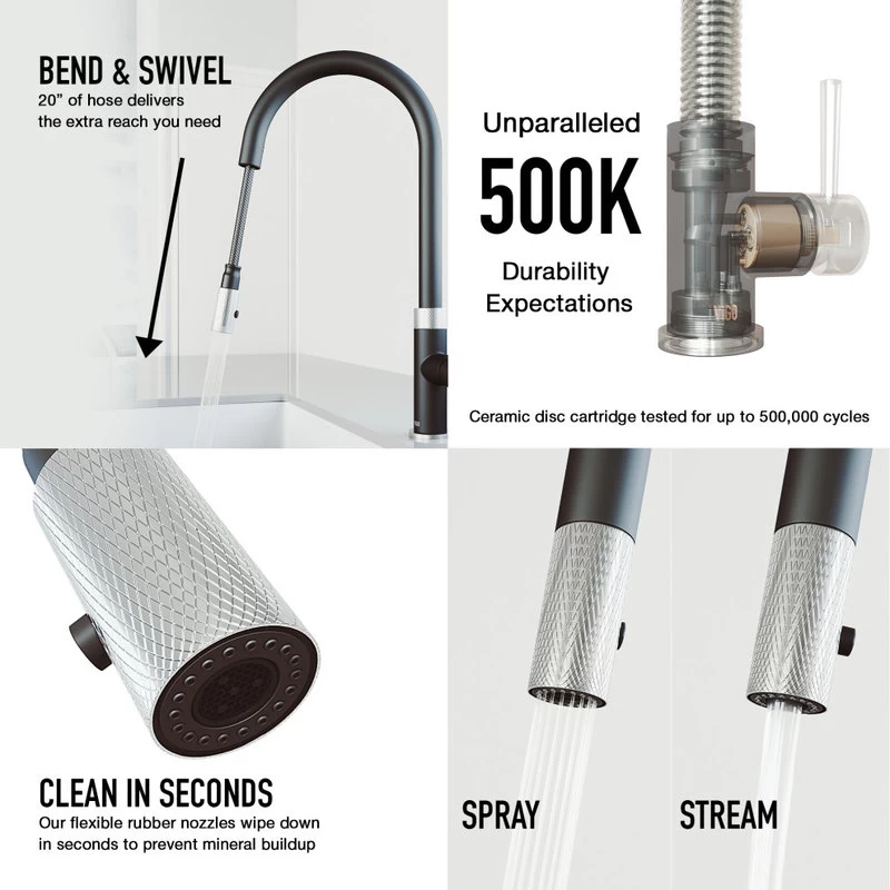 Contrasting textures and smooth finishes mark the beauty and elegance of The Bristol by VIGO. With VIGO’s exclusive 7-layer finish and diamond knurling, this pull-down kitchen sink faucet demonstrates a carefully curated design that highlights its attention to detail. Its dramatic high arch delivers a sleek silhouette and elegantly showcases the quality craftsmanship that marks all VIGO designs. Engineered for performance, it features a dual-action sprayer and single handle lever that elevates the functionality of your kitchen. With a sleek design and innovative technology, The Bristol ensures an exceptional kitchen experience.