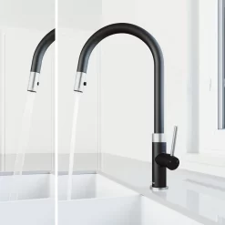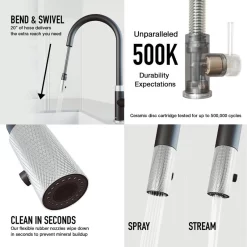 - Dual-action spray head: The multifunctional pulldown sprayer delivers an aerated flow of water or a powerful spray with the click of a button;