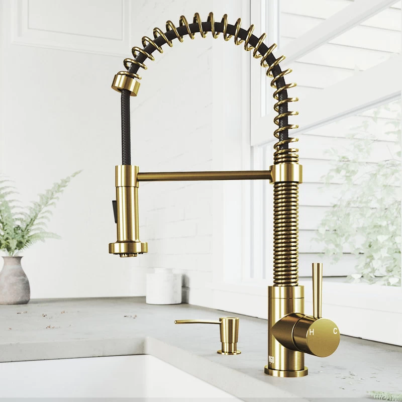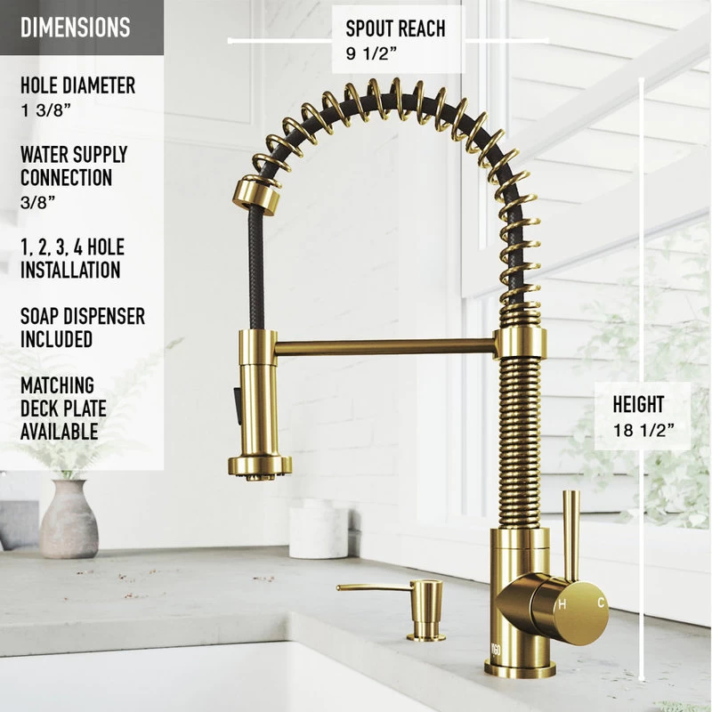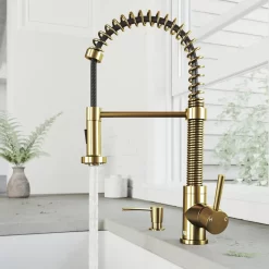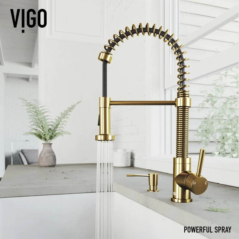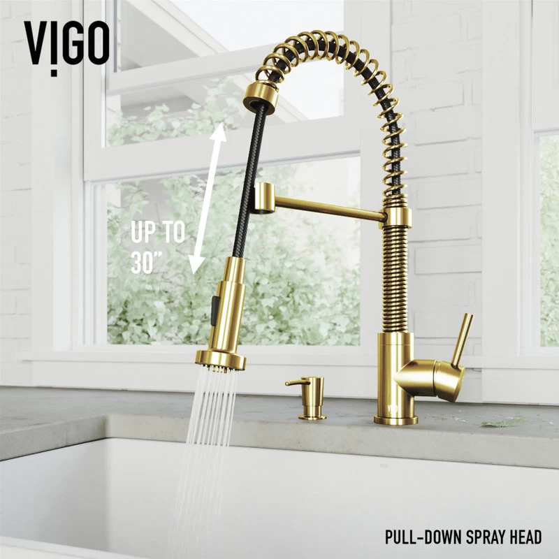 VIGO presents the Edison pull-down spray kitchen faucet and soap dispenser. This model includes an in-counter soap dispenser with a refillable reservoir holding up to 10 ounces of liquid soap or hand lotion. Its 360° swivel spout extends up to 30 inches, and its solid brass construction makes it a lasting fixture in your home. This kitchen faucet has a 1.8 GPM flow rate to conserve water without compromising the experience. Edison is ADA compliant with a single lever to grant effortless control over the water volume and temperature. With all mounting hardware and hot/cold waterlines included in a single package, the Edison kitchen sink faucet setup is ideal for completing your kitchen renovation.